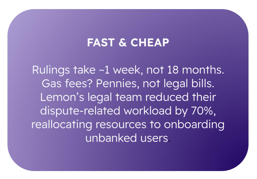 Lemon doesn’t play judge. Kleros’s decentralized jurors do, with 90% customer retention even for users who lose their case. Why? The process is transparent and auditable. Losing parties can’t blame “corrupt corporate interests”. They see cryptographic evidence and voting records.
