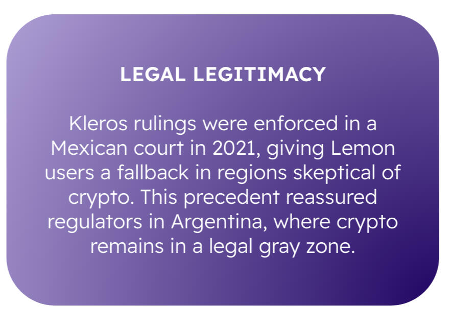 In Argentina, where inflation eats savings alive and crypto is a lifeline for millions, Lemon, a leading exchange with 4+ million users in LATAM, faced a problem. Users were losing money to hacks, phishing, or contested transactions, but Lemon’s internal team couldn’t resolve these conflicts fairly without becoming the “centralized authority” they promised to avoid. So they did what any crypto-native org would: they handed the issue to Kleros, a decentralized arbitration service for the disputes of the new economy.